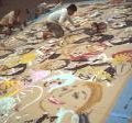 告知遅くなりましたが、競演者は、若い絵描き、八木亮太郎氏です。3年前かなー、渋谷駅で靴に絵を描いて暮らしていた頃の彼と会う機会あり、2年前のbe-inでの巨大折り鶴の時も手伝っていただきました。当時はポップな色使いと水玉柄の布とか何でもかんでもライヴペイントに切り貼りしていていた。しばらく会っていないが毎月精力的にライヴペイントに取り組んでいる様子。隠すことなく性や血(つまり[生]か)を描いているようで好きです。彼の姿は一見とてものほほんとしている様に見えるが中身は鋭いぞー。僕と八木亮太郎氏で30人ずつ計60人の顔を描いて繋げます。二人の絵描きが描くことで、多様な人種の居るこの街のように、この星のようになるかと思うが、そうは問屋が卸すわけが無いのがライヴだ、どうなるかわからぬ。おお楽しみだ。