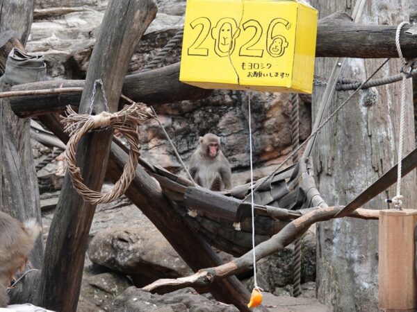 来園したお客様がX(旧ツイッター)に貴重な瞬間の動画をアップされてて、見ると「2026」と書かれた箱から垂れたヒモをニホンザルが引っ張った瞬間、箱がぱっかーんと見事にひらき、中から大量の落ち葉が落ちてきてる。お見事すぎる。