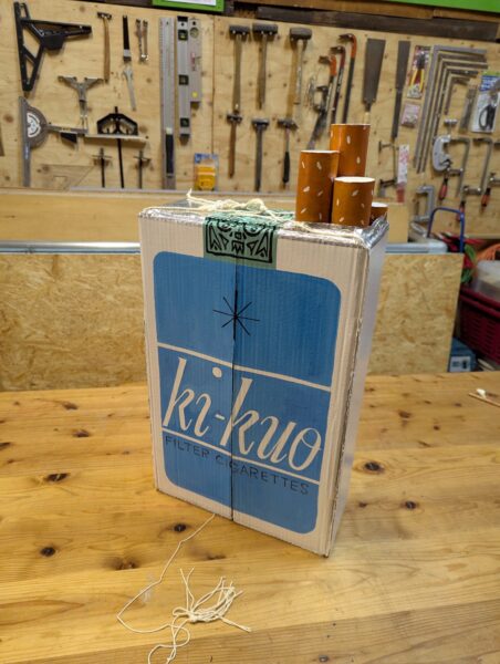 奇跡的に、個人のお名前とhi-liteのアルファベットの並びがよく似ているので、ラベルを個人のお名前に書き換える。僕はタバコを吸わないのでよく知らない。シェアアトリエくすのき荘のタバコを吸うメンバーに、タバコがソフトケースに何列で入っているのか、ケースから数本ちょびっと出てるイメージがあるがあれはどういう時に起きる現象なのか等々聞いたりして、たれ幕の上下の重りもタバコの形にして、組み上げる。